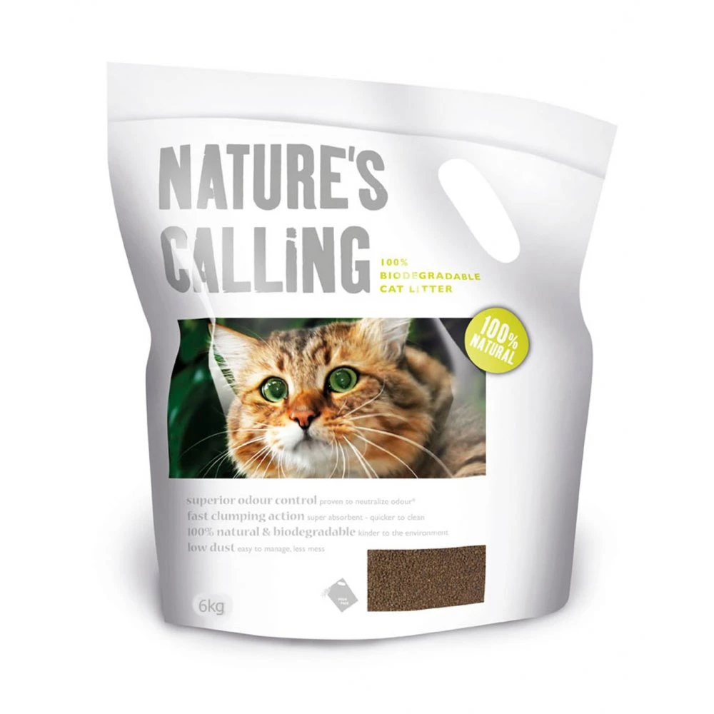 Natures calling Litter is made from the reclaimed lining of the walnut shell, and has a superior odour control proven to neautralise odour. Made from annually renewable resources, it is kinder to the environment and therefore safe to flush! It is 100% biodegradable and has a low dust content so it is easier to manage and clean