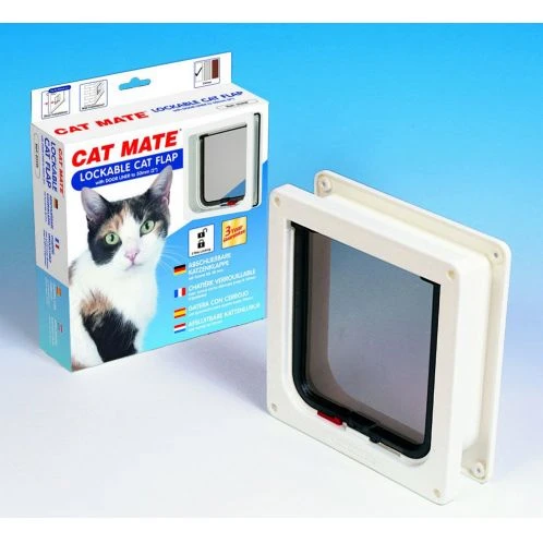 This high quality Pet Mate Lockable Cat Flap product with its unique trimmable door liner enables neat, easy installation in all doors, panels and walls. The silent action will not frighten pets or disturb owner. The transparent flap is preferred by most cats and is made from super tough polymer, making it draft and weatherproof with a fully brush sealed flap with magnetic closure