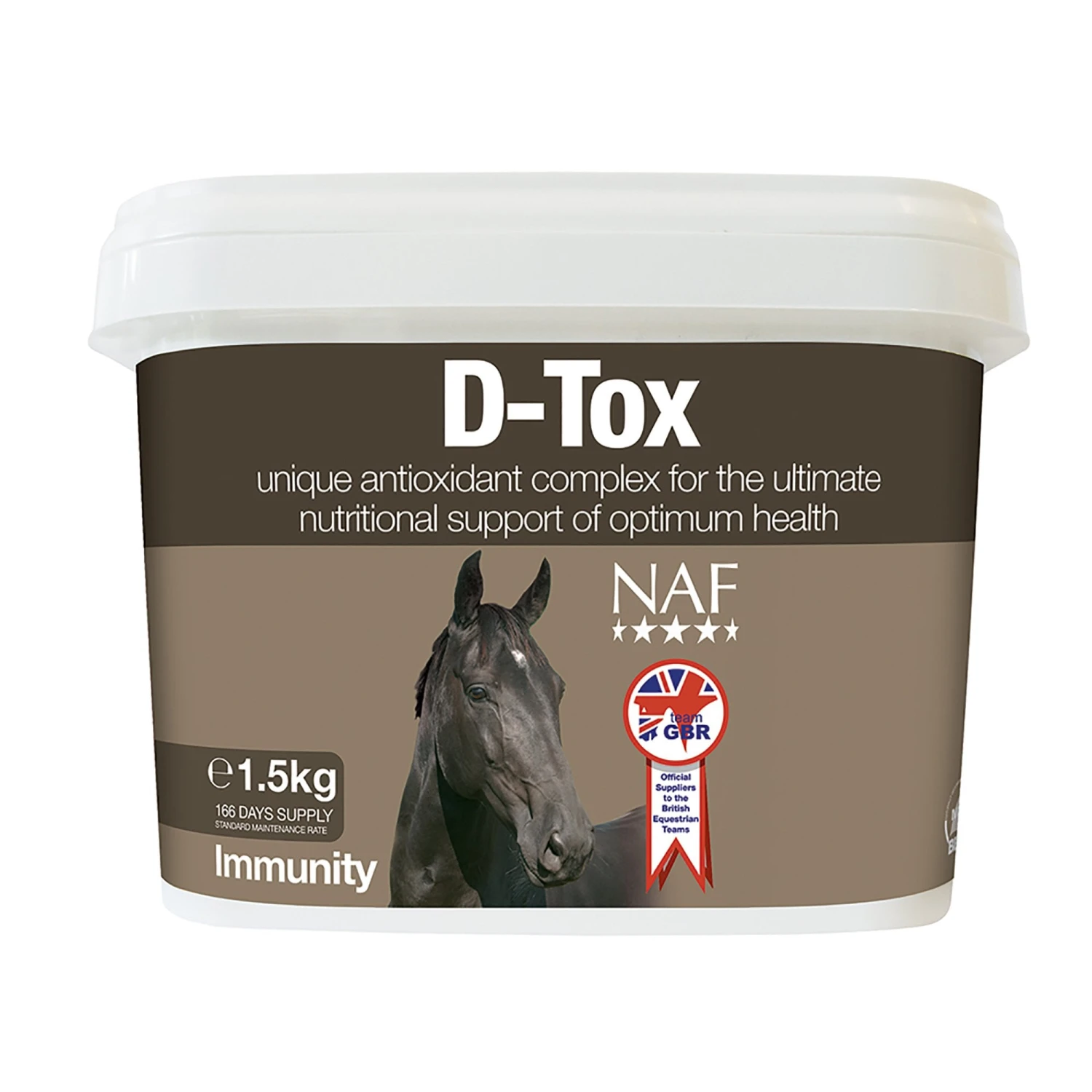 Naf D-Tox contains a unique complex of scientifically verified, naturally sourced antioxidants to harmlessly flush out excess toxins and restore the horse’s natural equilibrium. D-Tox may be used in a short, concentrated course where history or signs dictate. Fed at a lower maintenance level, D-Tox can be particularly helpful to the health of the performance horse, as hard work and regular travel will result in a build up of toxins within the system. D-Tox may be used alone, or fed in combination with specifically targeted NAF products to suit the individual requirements of each horse.