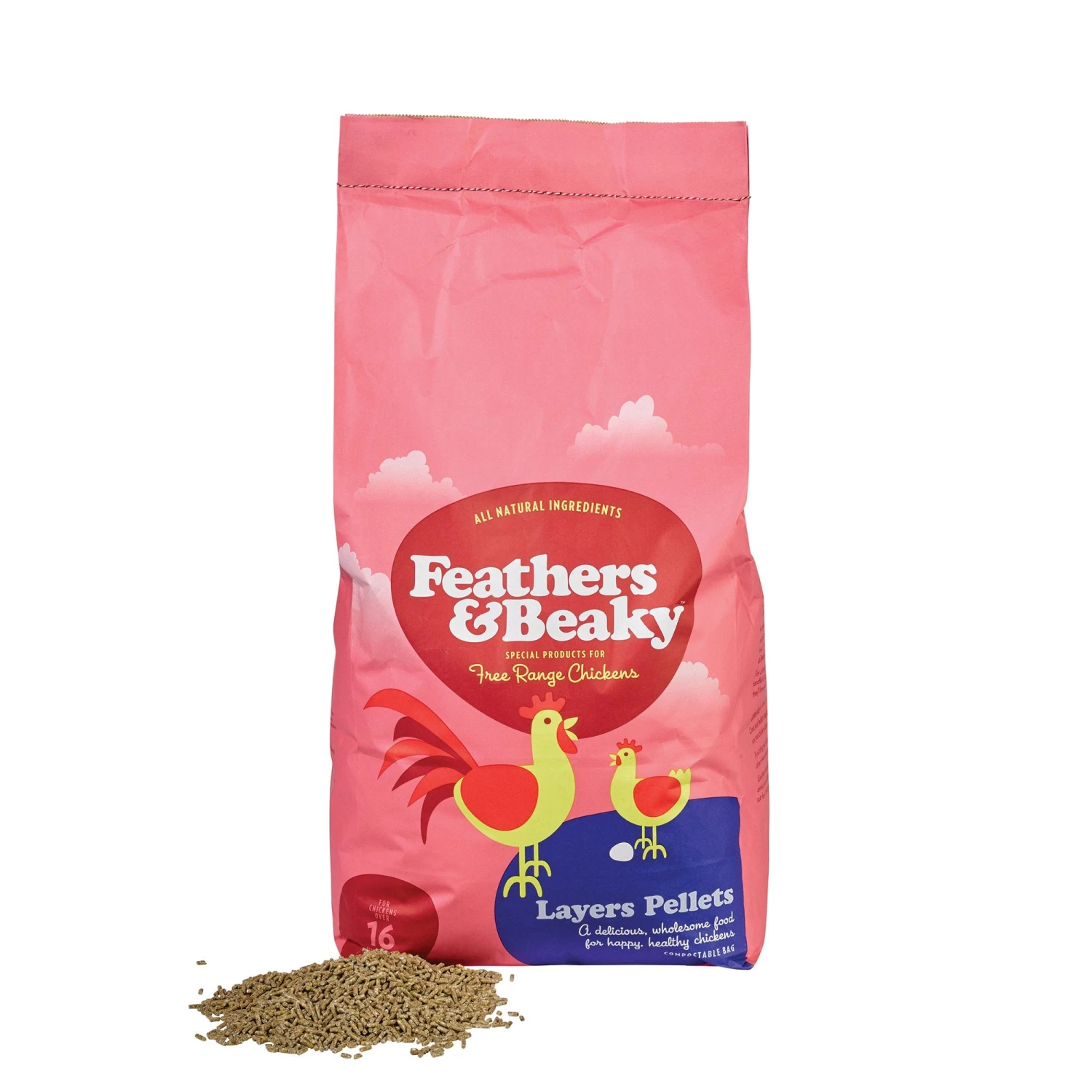 Feathers & Beaky Free Range Layers Pellets are for hens over 16 weeks and are also suitable for cockerels and roosters. Layers pellets should be a chicken’s main diet, with any treats being fed late in the day.