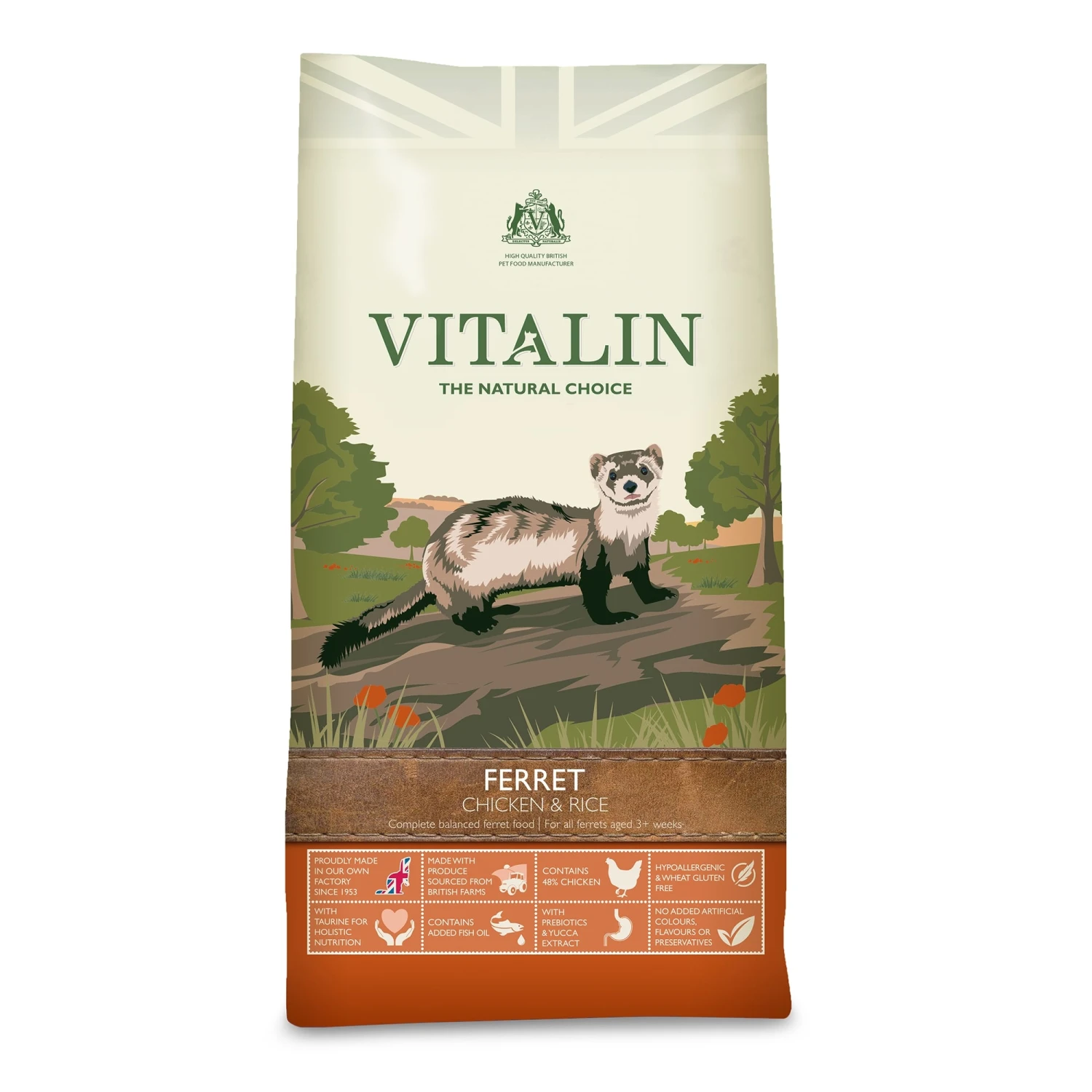 Vitalin Ferret Chicken & Rice is a complete, balanced pet food suitable for ferrets.