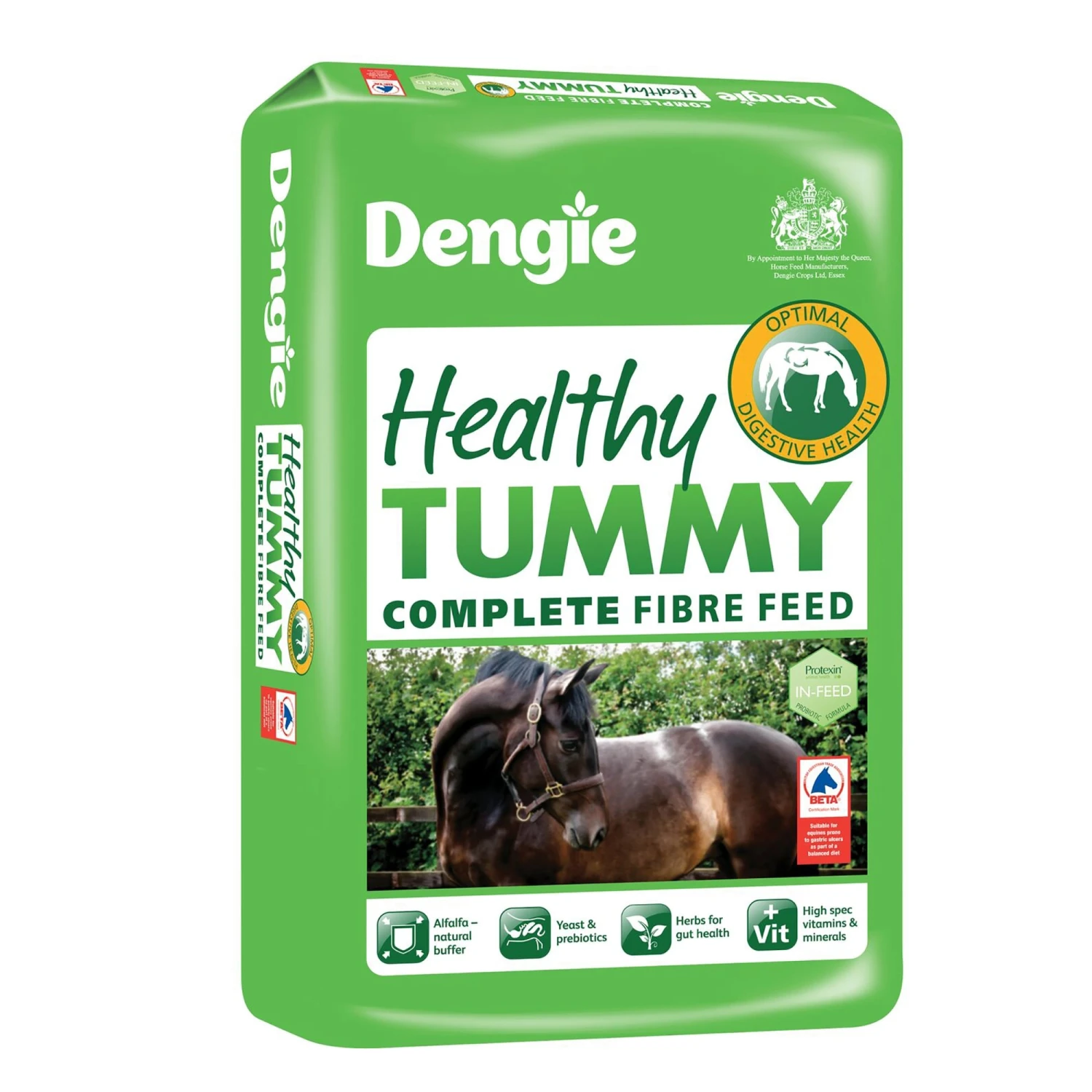 Dengie Healthy Tummy is a complete, high-calorie fibre feed containing the latest ingredients known to promote gut health including alfalfa.